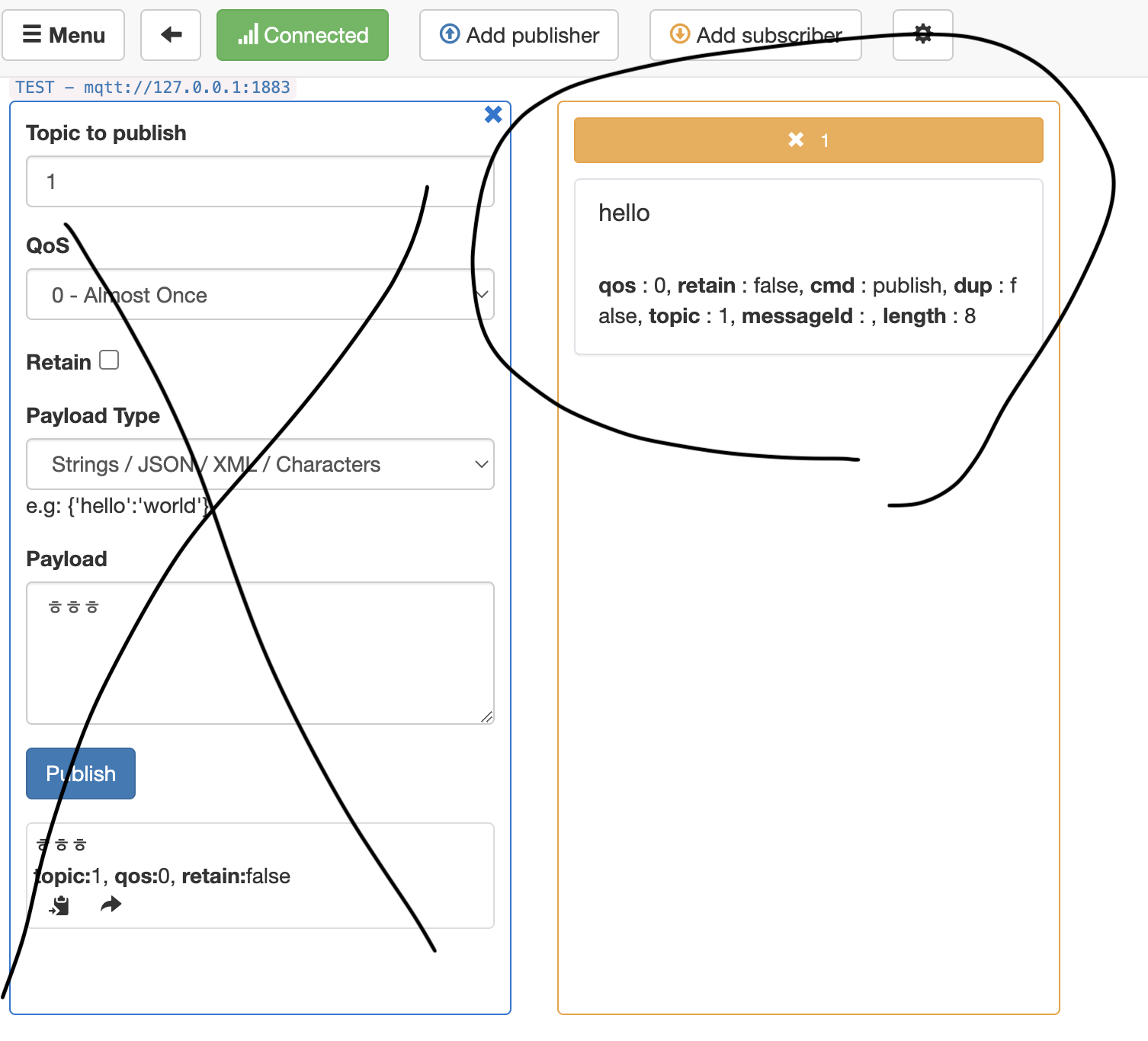 mosquitto_pub -h 127.0.0.1 -p 1883 -t 1 -i timetalkmaster -m "hello"