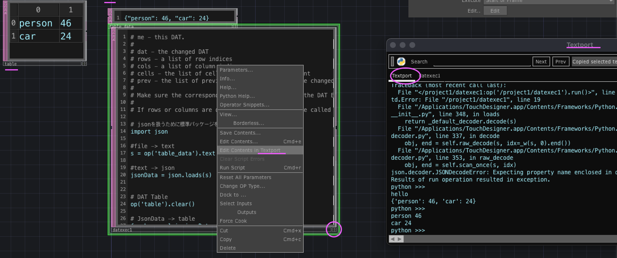 DAT 에서 오른마우스 Edit Contents in Textport 하면 콘솔창을 볼수있다.