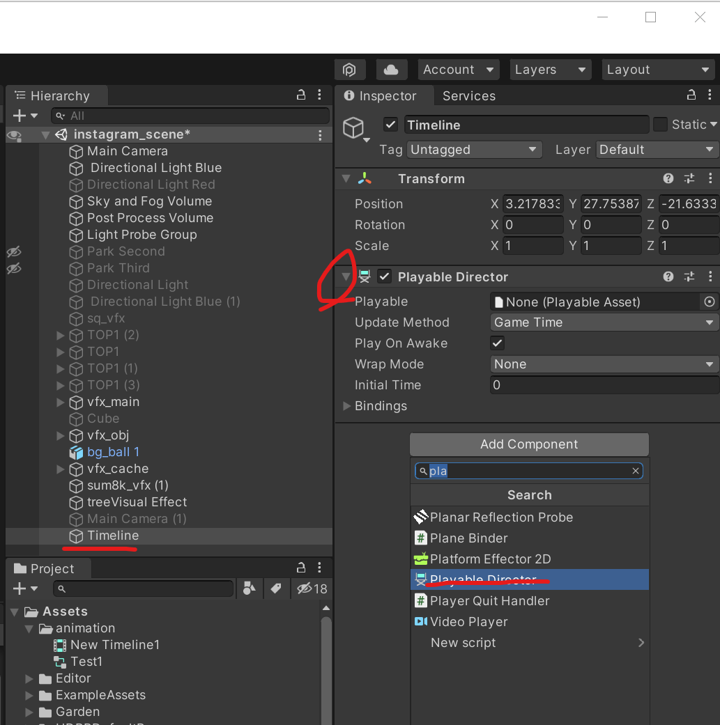 타임라인을 만들고 빈 오브젝트에 끌어넣으면 디렉터 자동생성됨.