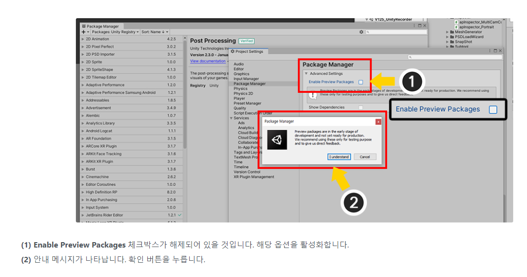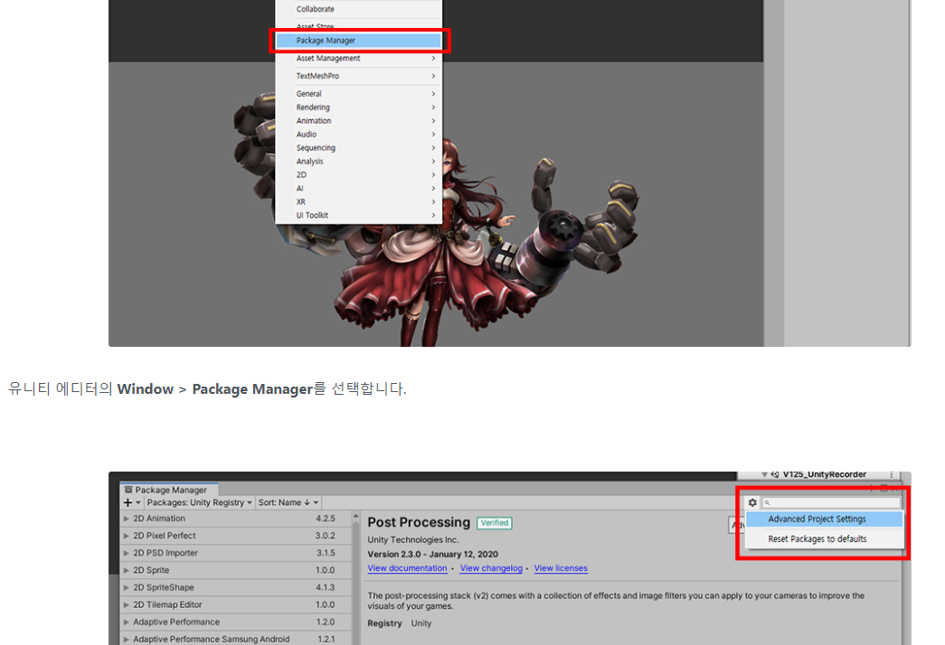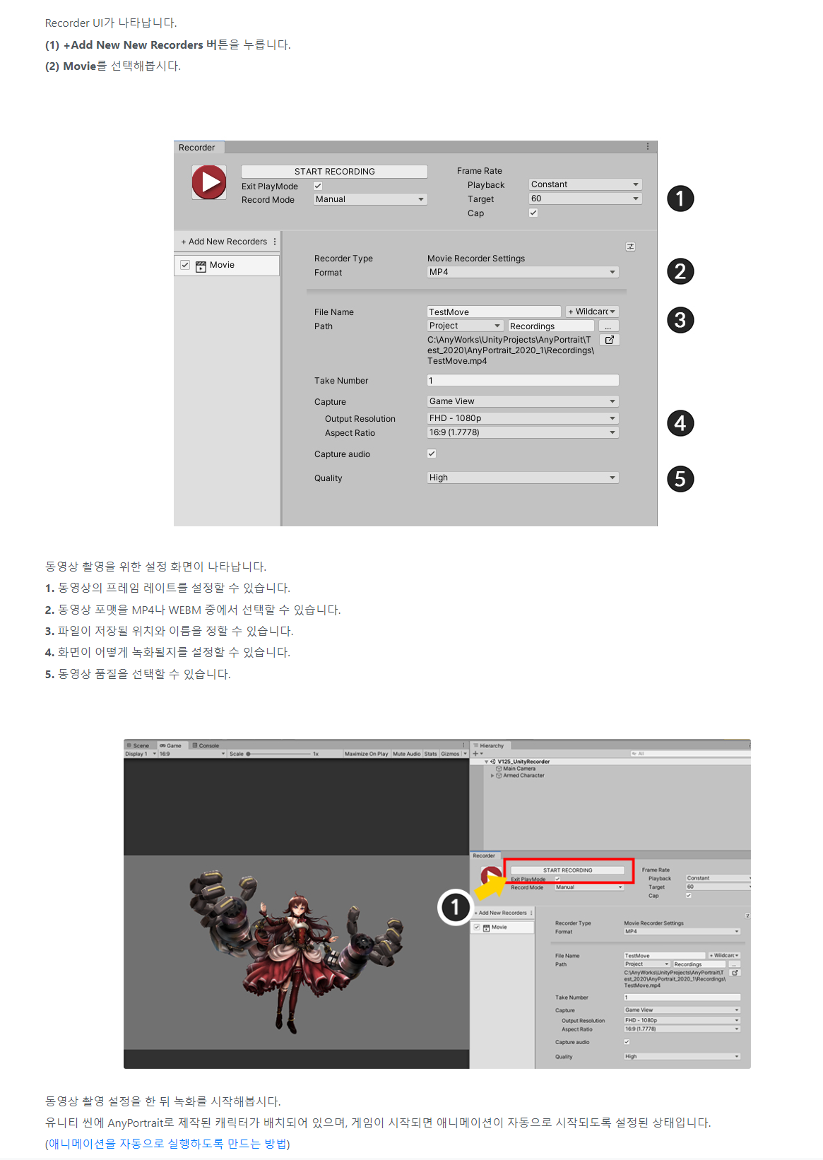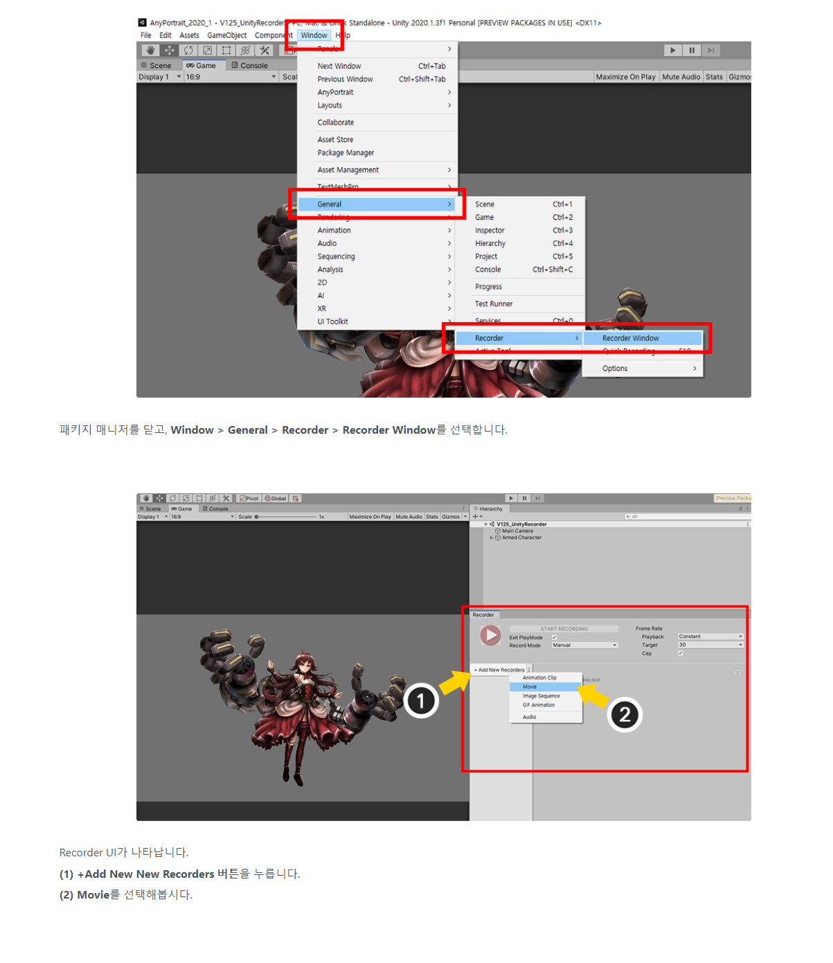 AnyPortrait > 메뉴얼 > Unity Recorder 사용하기 Unity Recorder 사용하기 1.2.5 유니티에서 제공하는 패키지 중에 "Unity Recorder"라는 재미있는 패키지가 있습니다. 이것은 유니티 에디터의 게임 중의 화면을