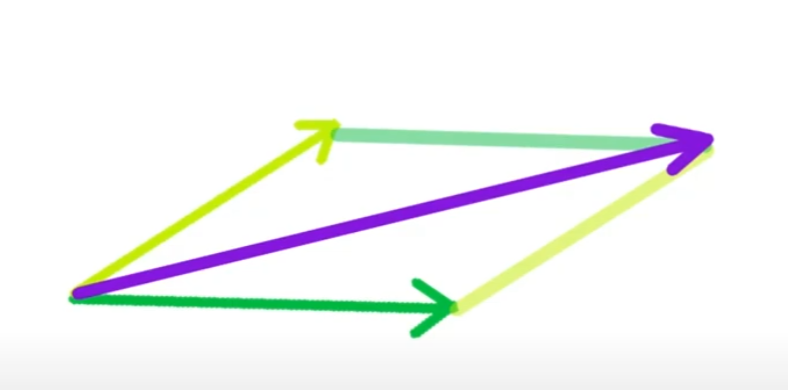 -> 삼각형법 : 맞물린지점 초록색 백터의 시점과 연두색 벡터의 종점을 가르키는 벡터가 합이된다.
