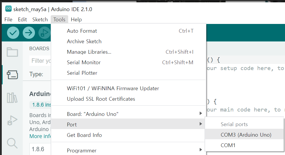 - 도구]->[보드]→[아두이노 AVR 보드]→<사용 중인 보드>