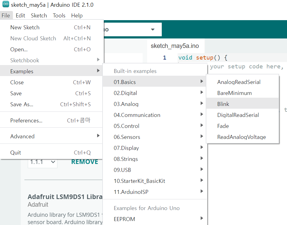 – [File]->[Examples]->[01.Basics]->[Blink]