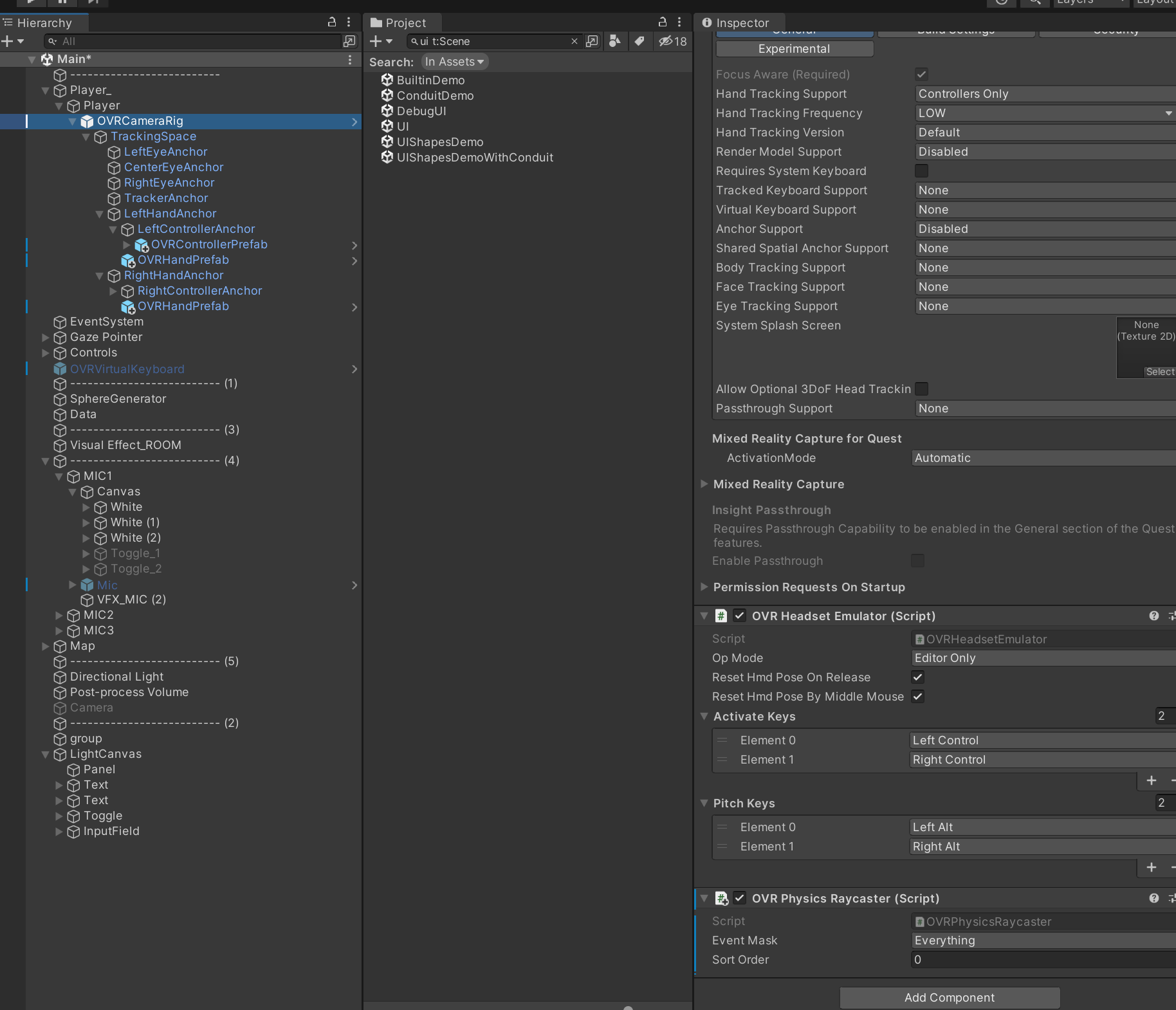 Hierachy:OVRGazePointer은 어디까지나 포인터(커서)를 나타내기 위한 오브젝트일 뿐, 상호작용과는 별개다. 상호작용은 Hierach:EventSystem의 OVR Input Module 컴포넌트가 담당하고 있다.
