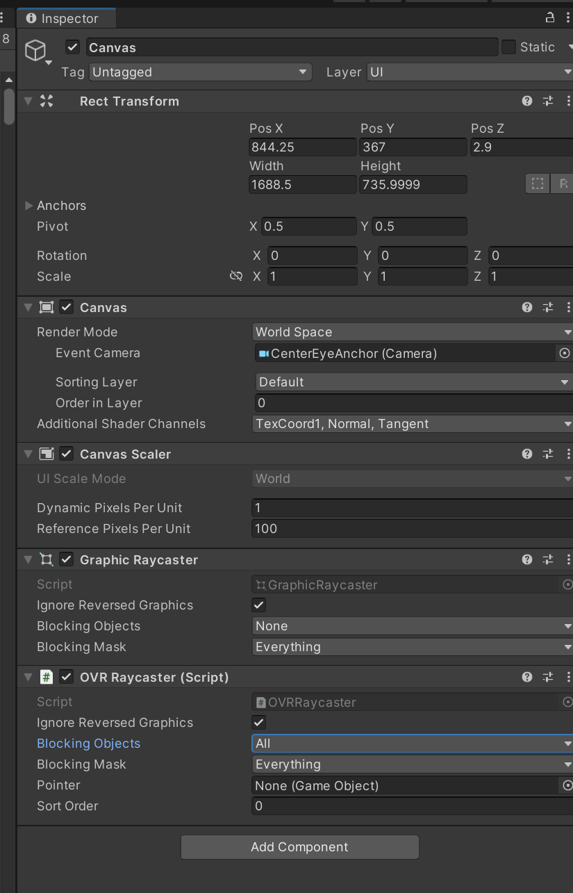 14. 캔버스에서 그래픽 레이캐스터 구성 요소를 제거합니다. OVRRaycaster가 이를 대체합니다.
