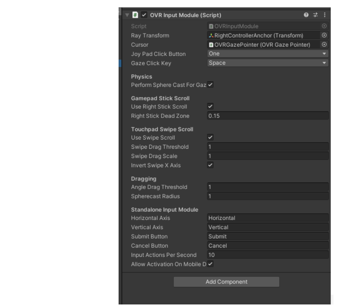 13. 이벤트 시스템에서 StandaloneInputModule 구성 요소를 삭제했는지 확인합니다. OVRInputModule 스크립트가 이를 대체합니다. *************************************