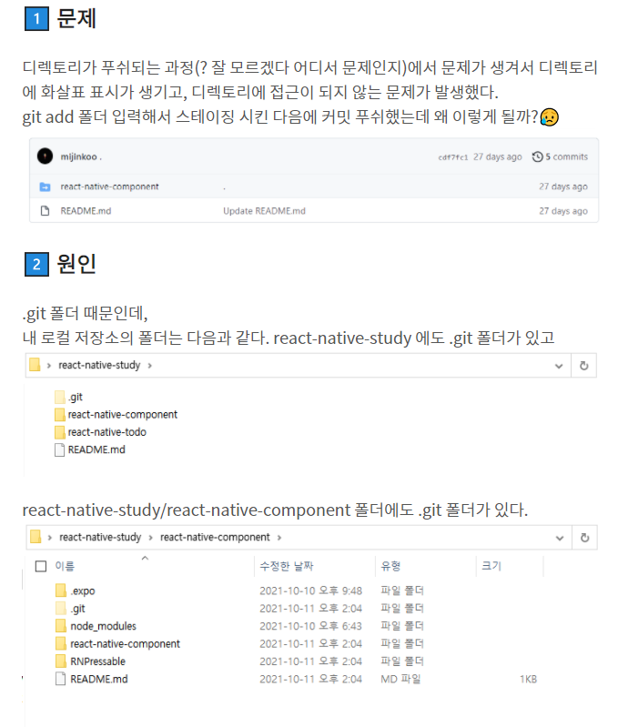 [깃헙왕초보] 디렉토리에 화살표 표시가 있을 때 (폴더가 클릭이 안 될 때)