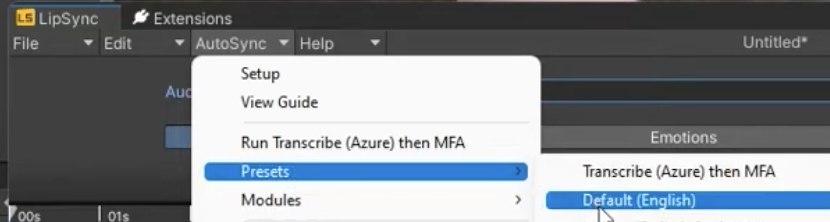 AutoSync 메뉴로 이동하여 AutoSync > Presets > Default를 클릭합니다 . 진행률 표시줄이 나타나고 몇 초 후에 타임라인을 따라 음소 표시가 나타납니다.
