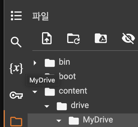1. 현재 위치 확인하기 구글 드라이브에서 코랩 노트북을 열고 코드 셀에 'pwd'를 입력한다. 실행 후 '/content'라는 경로에 있음을 확인할 수 있다. 빨간 동그라미 속 아이콘을 클릭하면 파일 탐색을