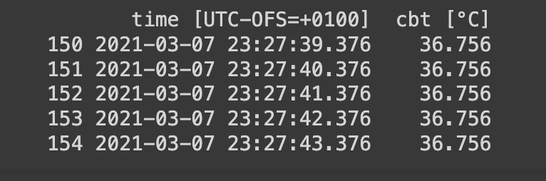 목표는 특정 체온을 측정했을 때의 시간을 예측하는 것이므로, temp_a0 [mC] 또는 temp_a1 [mC], 혹은 cbt [mC] 중에서 체온 데이터로 가장 적합한 열을 사용할 수 있습니다. 시간 예측에는 time [UTC-OFS=+0100] 열의 데이터를 사용할 수 있습니다.
