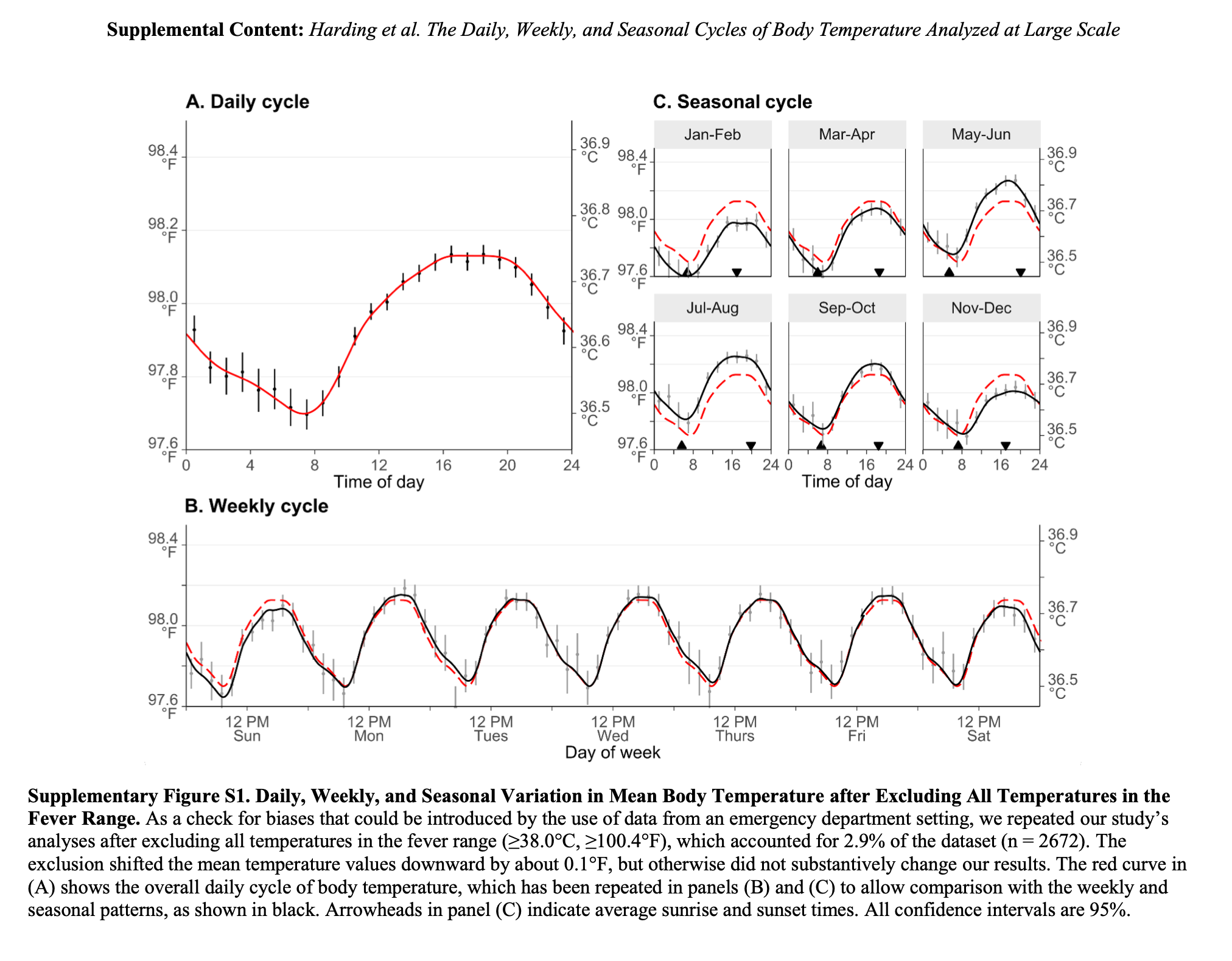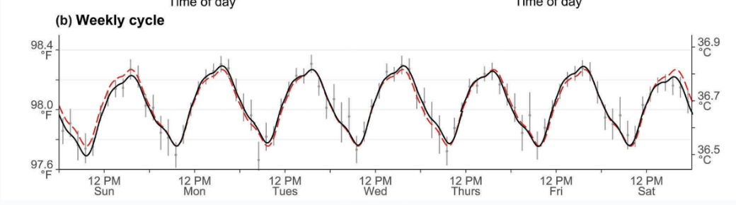 C. Harding, F. Pompei, S. F. Bordonaro, D. C. McGillicuddy, D. Burmistrov, and L. D. Sanchez, “The daily, weekly, and seasonal cycles of body temperature analyzed at large scale,” Chronobiology International, vol. 36, no. 12, pp. 1646–1657, Dec. 2019, doi: 10.1080/07420528.2019.1663863.