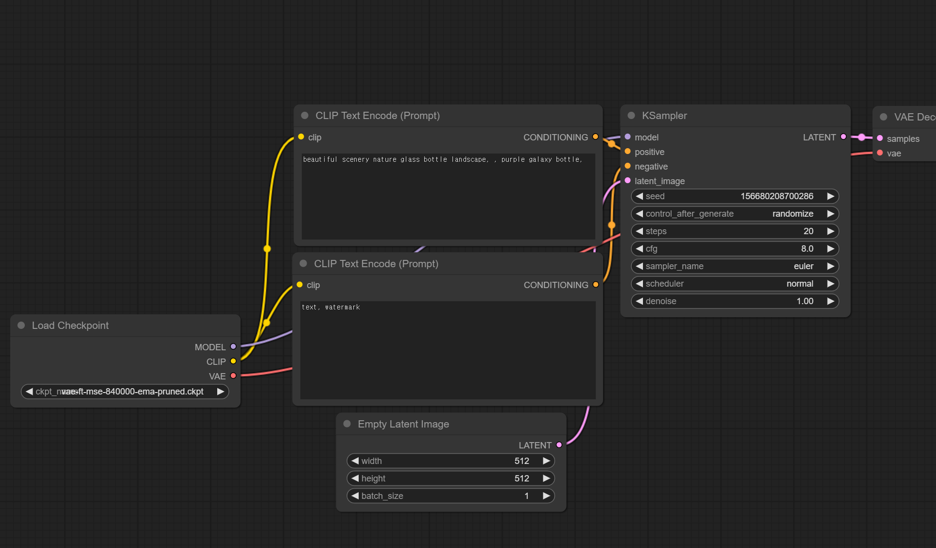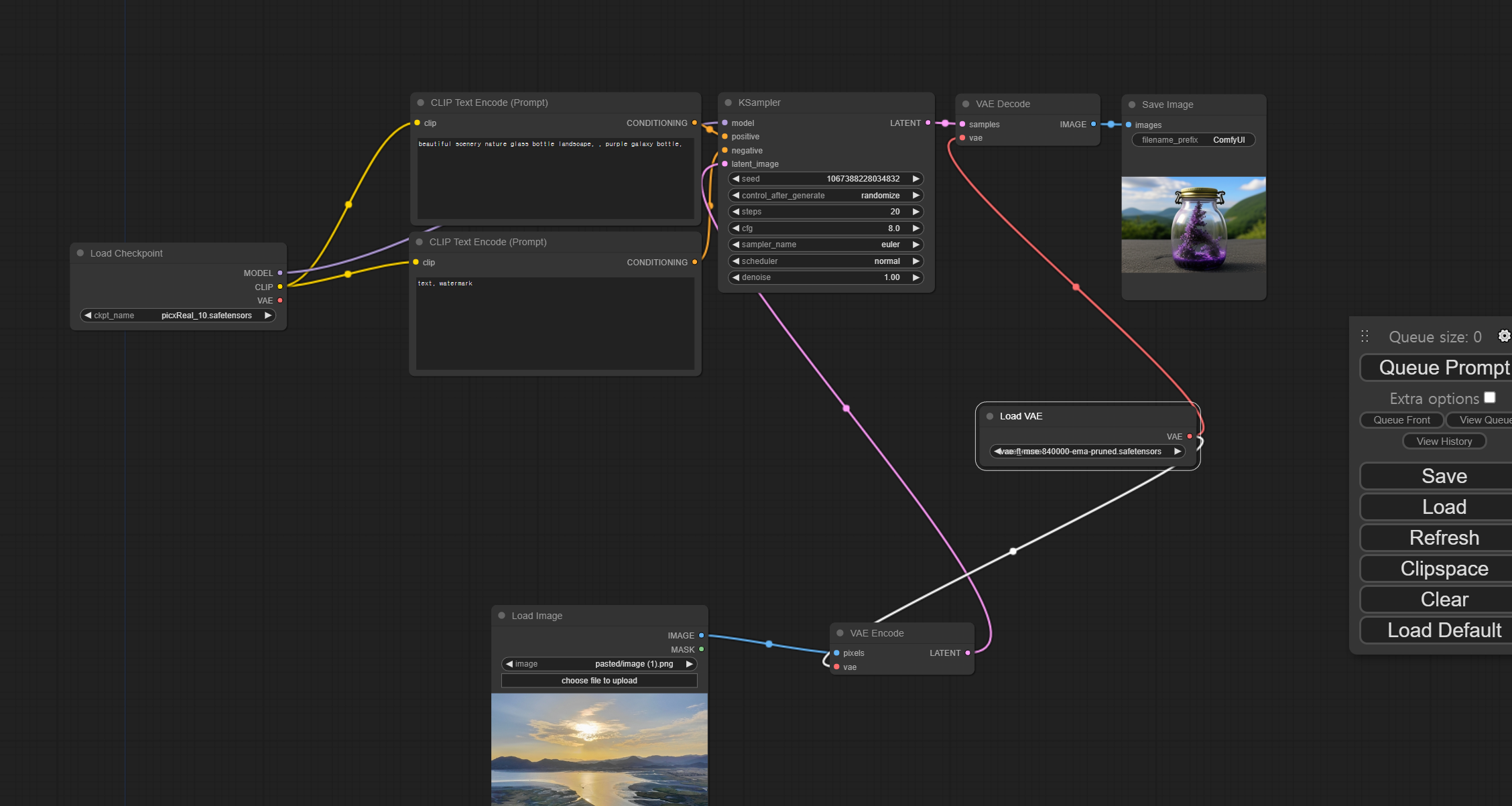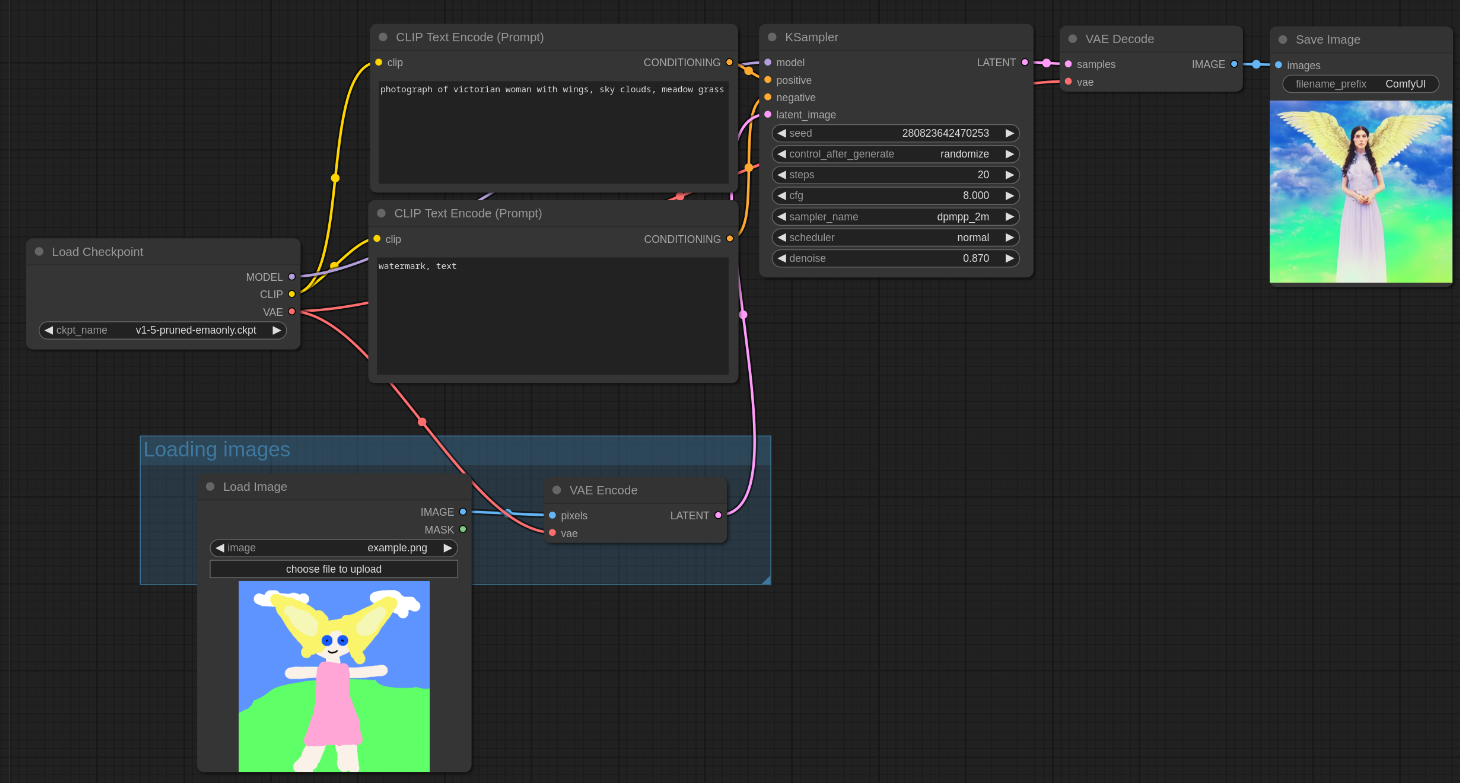 이것은 간단한 img2img 워크플로의 모습입니다. 기본 txt2img 워크플로와 동일하지만 노이즈 제거가 0.87로 설정되고 로드된 이미지가 빈 이미지 대신 샘플러에 전달됩니다.