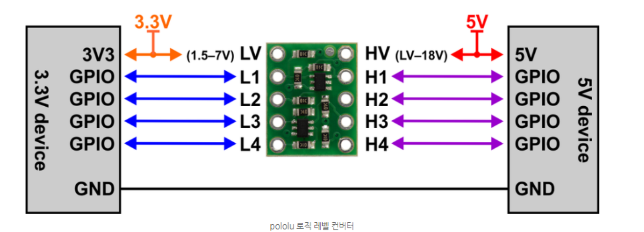 'HV' 핀에 고전압(예: 5V), 'LV'에 저전압(예: 2.8V), 시스템에서 'GND' 핀으로 접지.