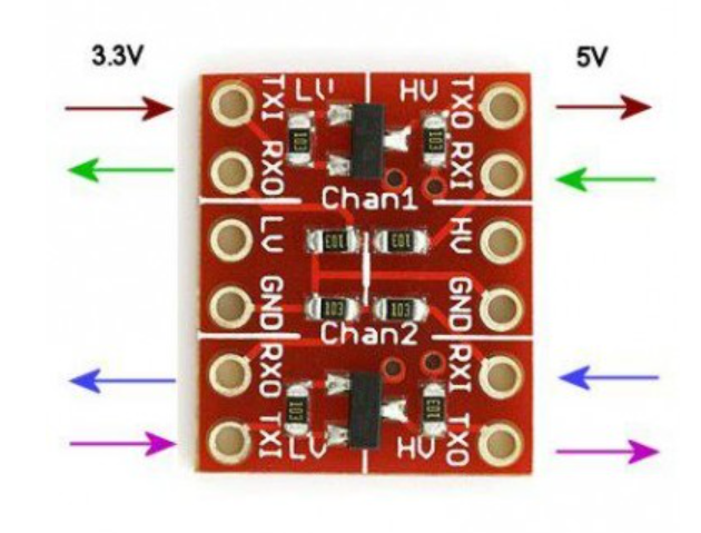 핀은 I nputs 및 O utputs로 레이블이 지정됩니다. 이것들은 보드에 상대적입니다. 5V 측의 RXI 핀으로 들어가는 디지털 핀은 3.3V 측의 RXO 핀에 3.3V로 표시됩니다. 3.3V 측의 TXI 핀으로 들어가는 디지털 핀은 5V 측의 TXO 핀에 5V로 표시됩니다.