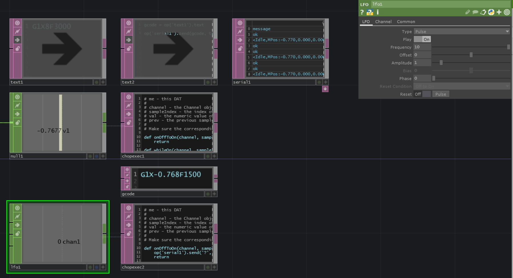 - LfoCHOP로 10Hz의 펄스를 만들고 ChopexecDat에서 On이 되었을 때 위치 요청 명령 ? 을 보내도록 합니다. SerialDat에 위치 정보가 돌아온다고 생각합니다.