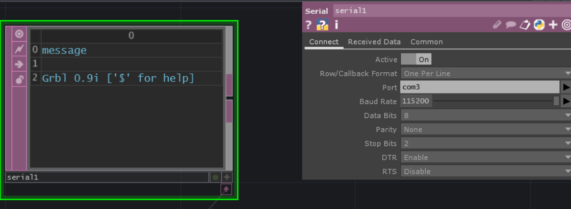 SerialDAT 구성: TouchDesigner에서 CNC 기계를 제어하려면 먼저 SerialDAT를 설정하세요. UGS에서 사용하는 직렬 포트 설정(예: 115200bps의 전송 속도)을 일치시키세요. SerialDAT가 연결되어 있고 Grbl로부터 메시지를 성공적으로 수신하는지 확인하세요.