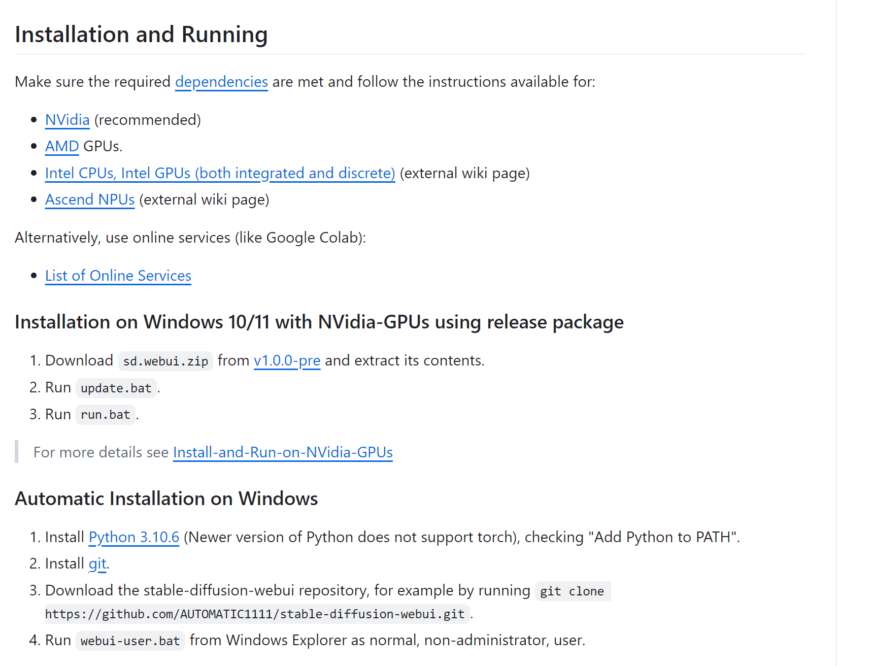 The webui.zip is a binary distribution for people who can't install python and git. Everything is included - just double click run.bat to launch. No requirements apart from Windows 10. NVIDIA only....