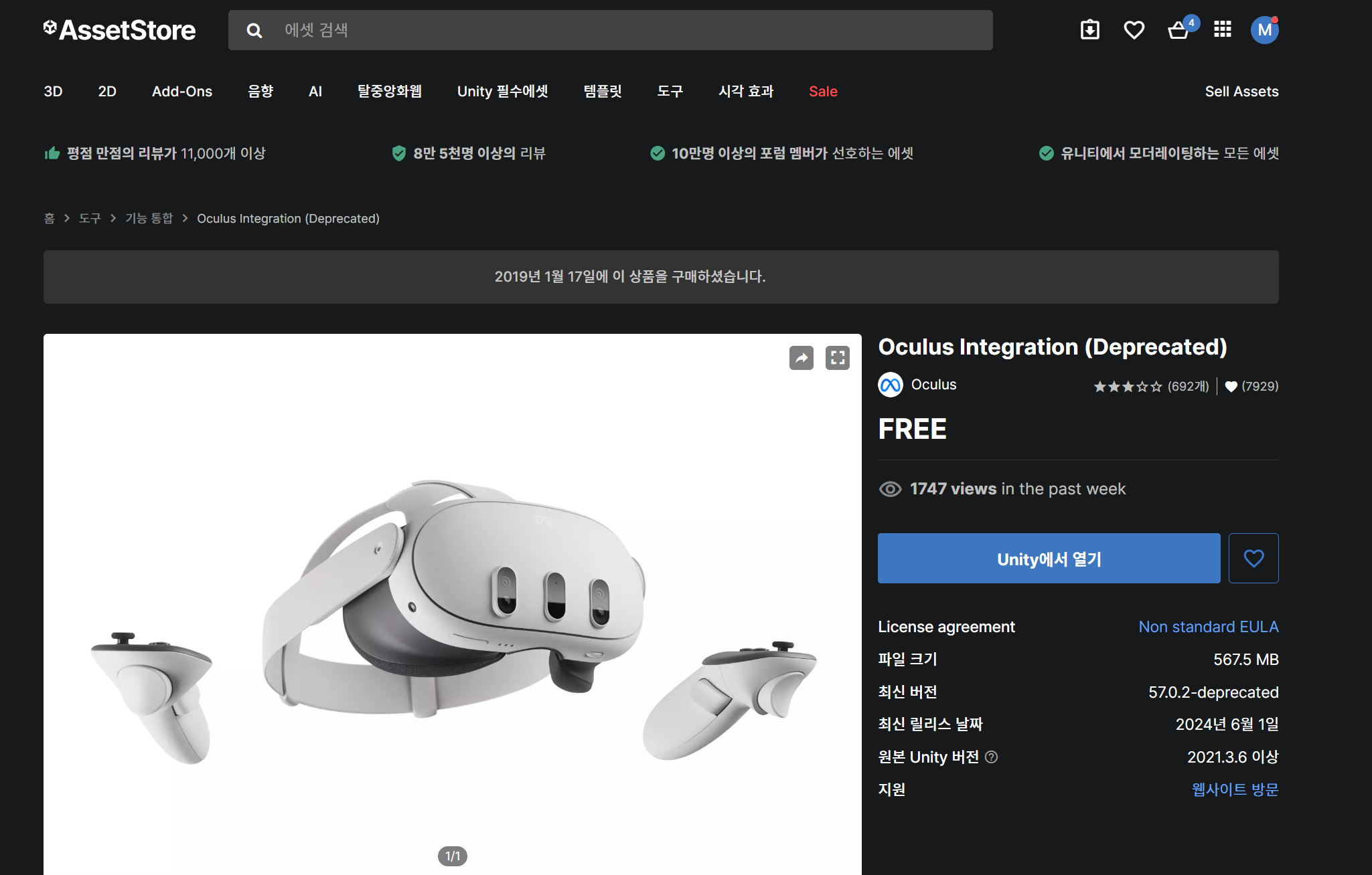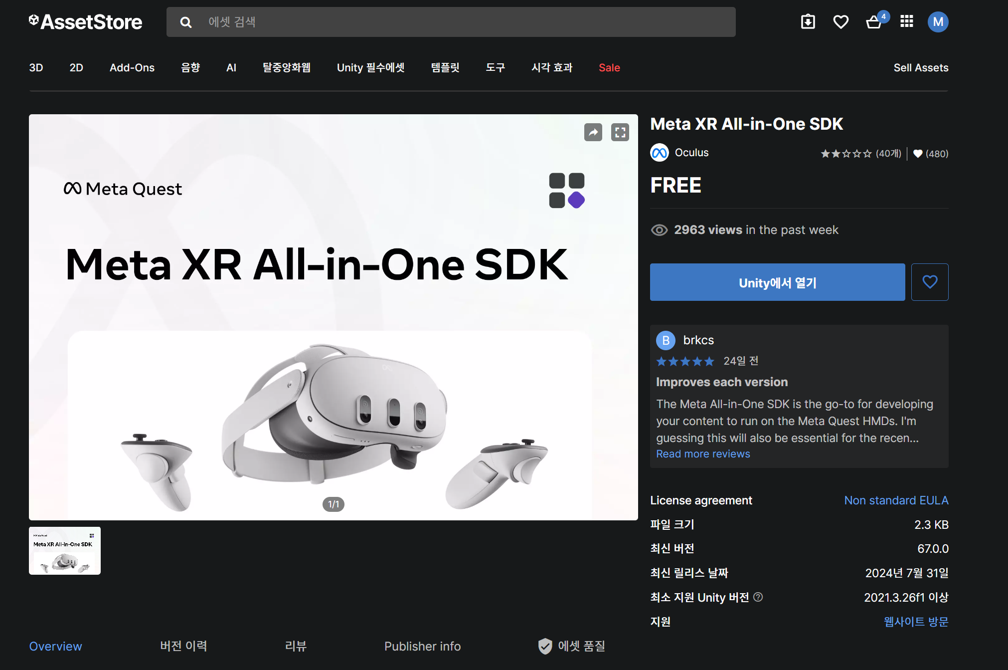 unity asset store 에서 Meta XR All-in-One SDK 다운받기