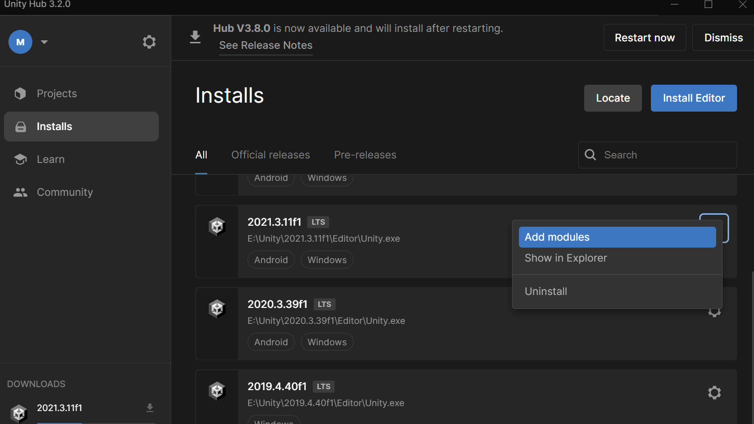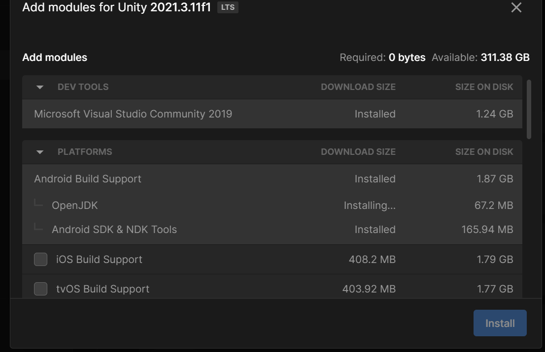 1. 유니티 버전에 모듈 추가.