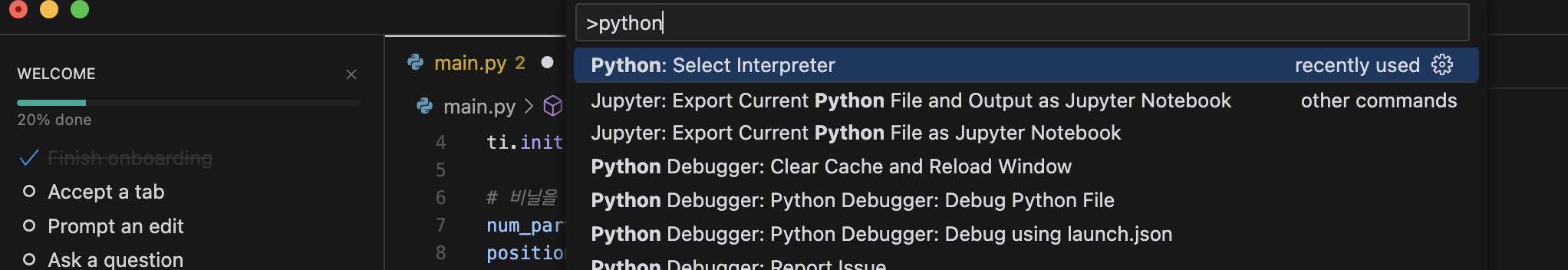 명령 팔레트에 Python: Select Interpreter를 입력하고 선택하세요.