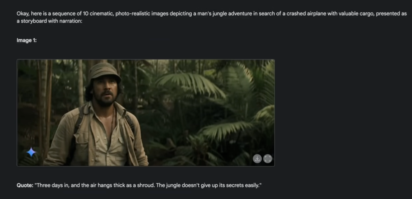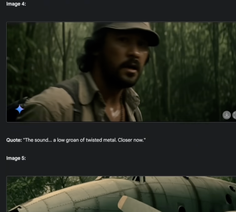 Generate 10 cinematic, photo-realistic, high-quality images for a fictional film about a Jungle adventure which a man is searching for a crashed airplane with a valuable cargo. Use this as a starting point and imagine the next sequence of scenes. Ensure there is a variety of shot types in the images, keep the character and outfit extremely consistent, and make sure the character is visible in every shot. Create a series of separate images, each depicting a distinct moment in the story, presented in sequential order like a storyboard. Include quotes for each image to narrate the events happening within it. Ensure the flow between images is consistent and logical, with each one styled like a cinematic movie shot that advances the narrative. Maintain the visual style across all images to keep them cohesive.