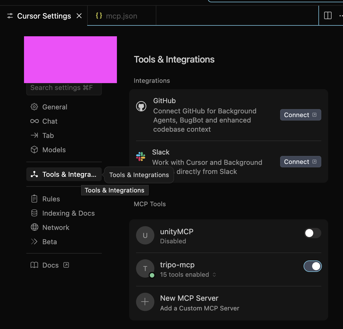 5. Cursor mcp.json 내용 : tripo를 mcp 이용하려면 아래 코드 추가