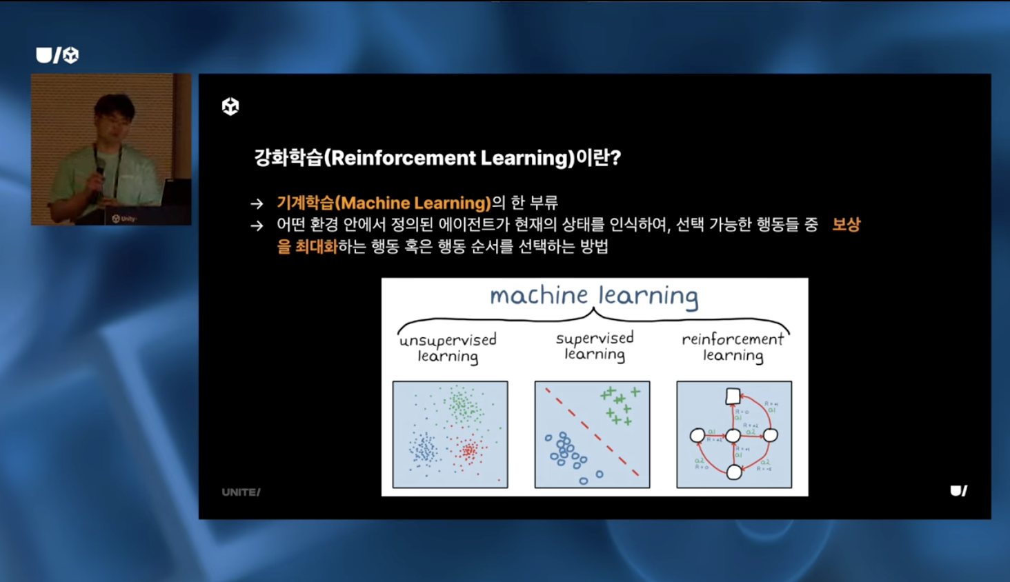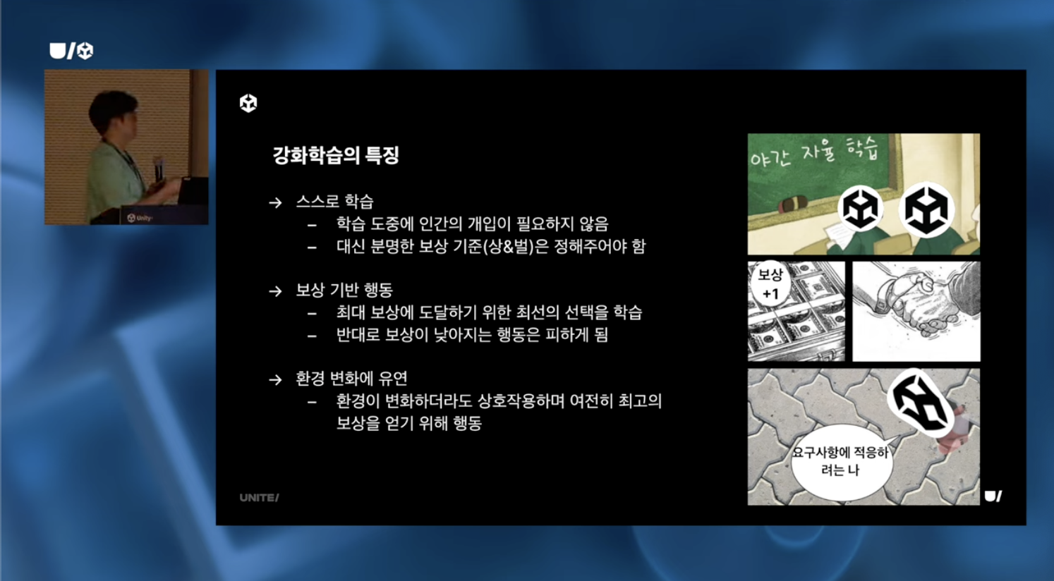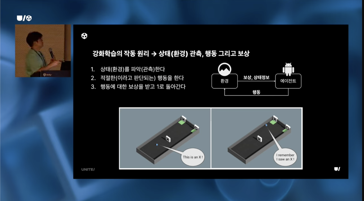 환경이 있고, 규칙(+,-)이있다. 에이전트는 점수를 얻기위해 발전한다.