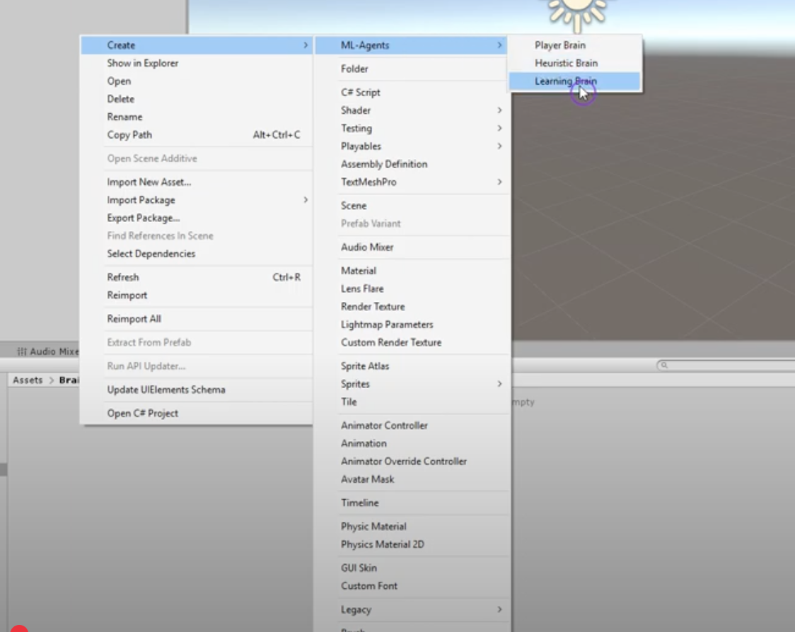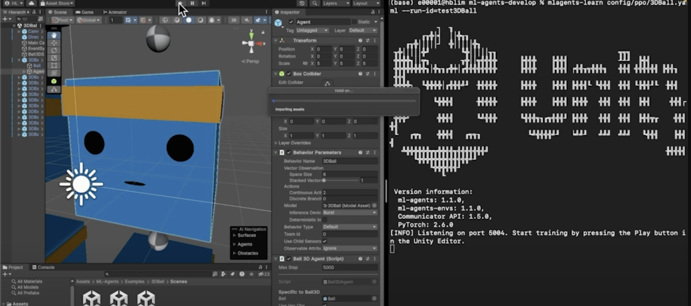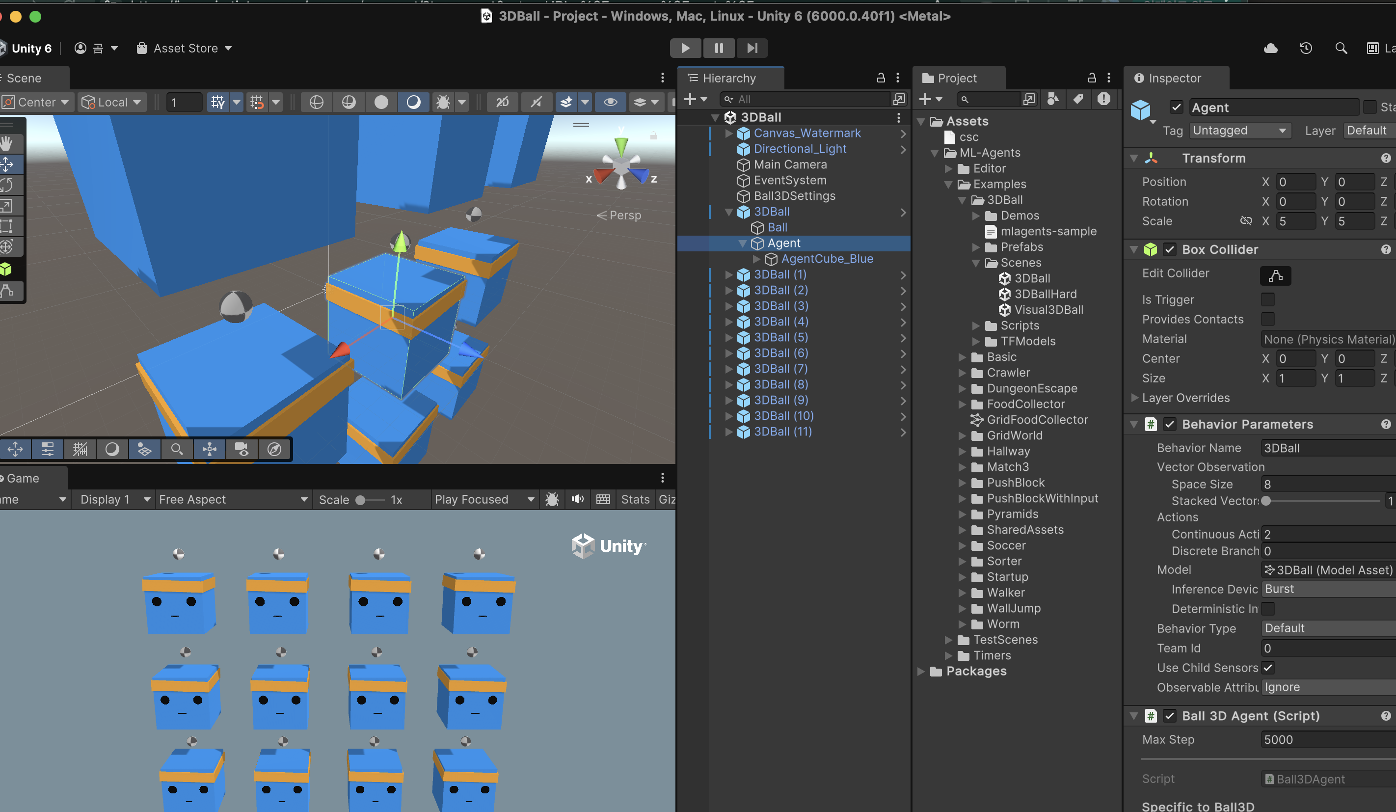 ex로 공학습있음. 씬켜보면 agent 에 behavlor parameters있음