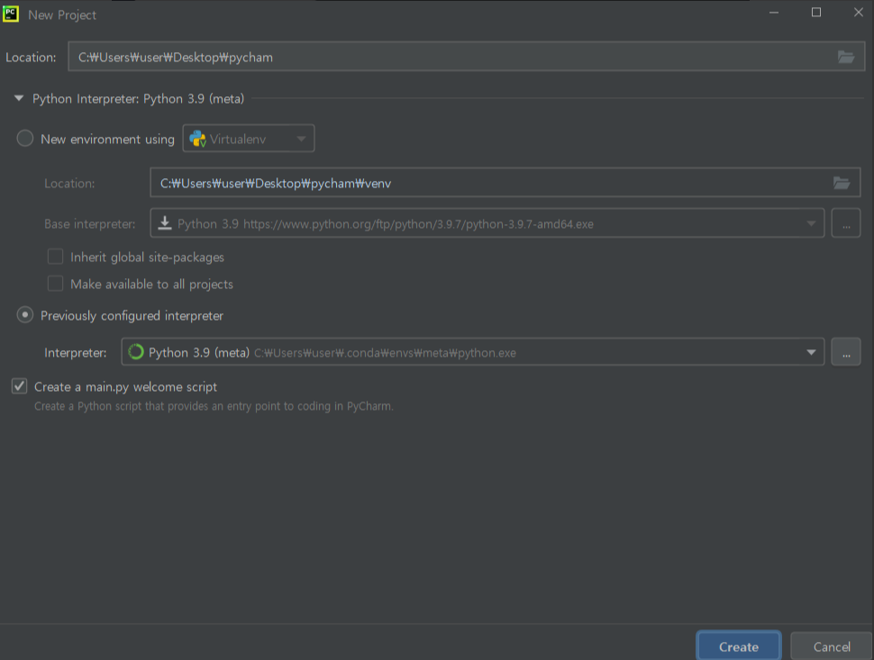 메타라는 가상환경 만들기 (파이썬 3.9.7 을 쓴다)