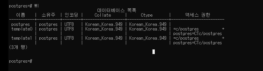 'psql -U postgres를 입력하고, 미리 설정한 암호를 입력하면 psql쉘을 실행할 수 있다.