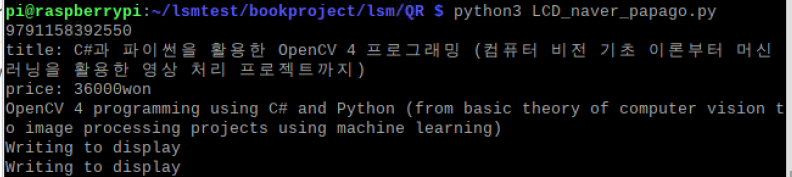 display.lcd_display_string(book["price"]+"won", 2) # Write line of text to second line of display