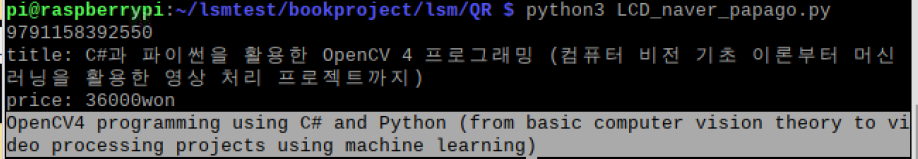 display.lcd_display_string(book["price"]+"won", 2) # Write line of text to second line of display