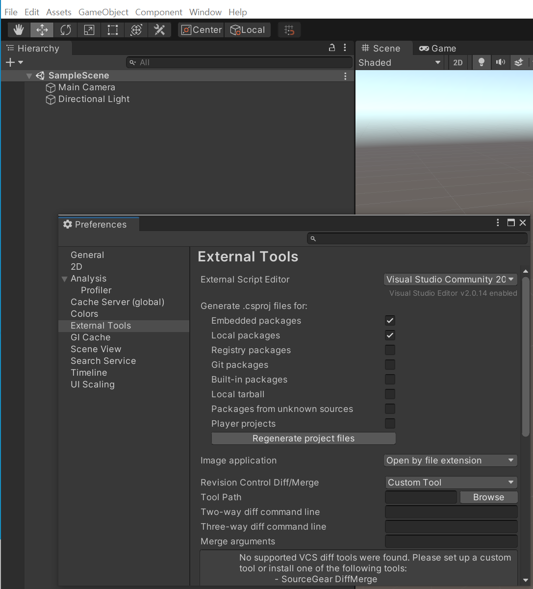 유니티 프리퍼런스에서 비쥬얼스튜디오와 연결해준다.