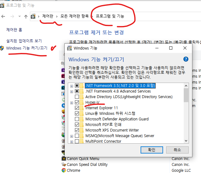 제어판 > 프로그램 및 기능 > window 기능 켜기/끄기 > Hyper-V 켜기