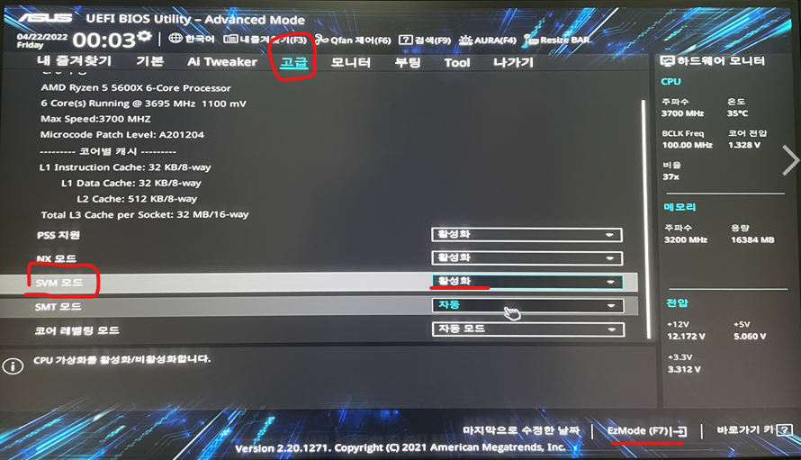 4. 그래도 가상화 사용으로 안 돼있다면, -> AMD 라이젠 메인보드들에서는 "SVM mode"를 찾아 활성화