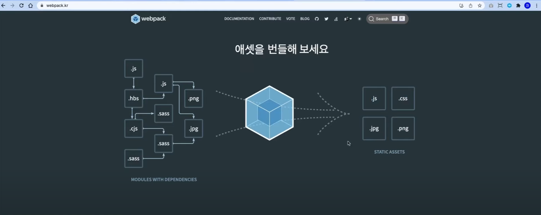 다양한 언어, 파일, 에셋을 -> js css jpg png(static asset)로 간단하고 빠르게